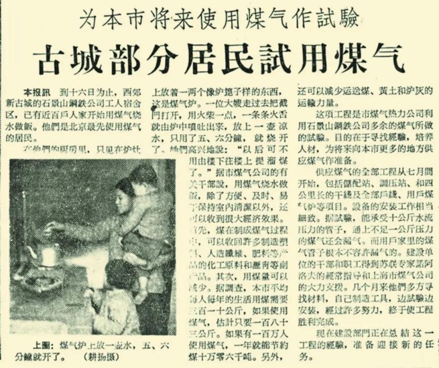 1958年12月19日3版报道《古城部分居民试用煤气》图源:京报网
